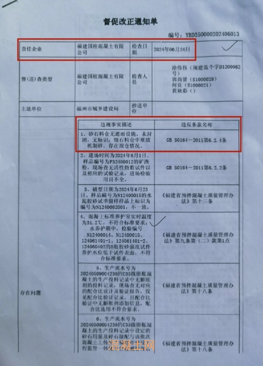 2024年6月26日,福建省建设工程质量安全总站检查中发现砂石料仓无遮雨设施,未封闭等问题,并下达《督促改正通知单》要求搭建钢结构建筑物。郑先生多次催促国柱公司依约履行合同,但国柱公司实际控制人郭钦柱却故意回避问题。