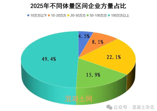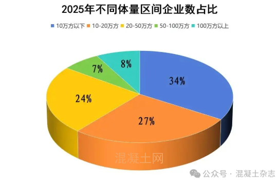 2025年度,我市预拌混凝土企业主动缩减产能。20万方以下企业数量占比高达61%,该规模企业总产量却仅占全市总产量的12.6%。产量在100万方以上的大中型企业数量占比仅8%,但其产量占比却高达49.4%,控制着近半数的市场份额。商混企业集团化经营的趋势和优势越来越明显。