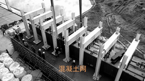 图中灰色船状设备是混凝土盖梁外壳。