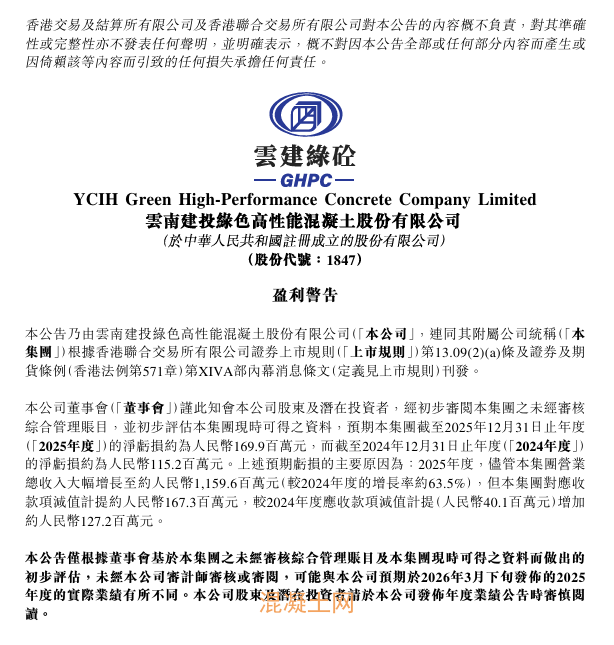 云南建投混凝土(01847.HK)公告,预期集团截至2025年12月31日止年度(「2025年度」)的净亏损约为人民币1.7亿元,而截至2024年12月31日止年度(「2024年度」)的净亏损约为人民币1.15亿元。