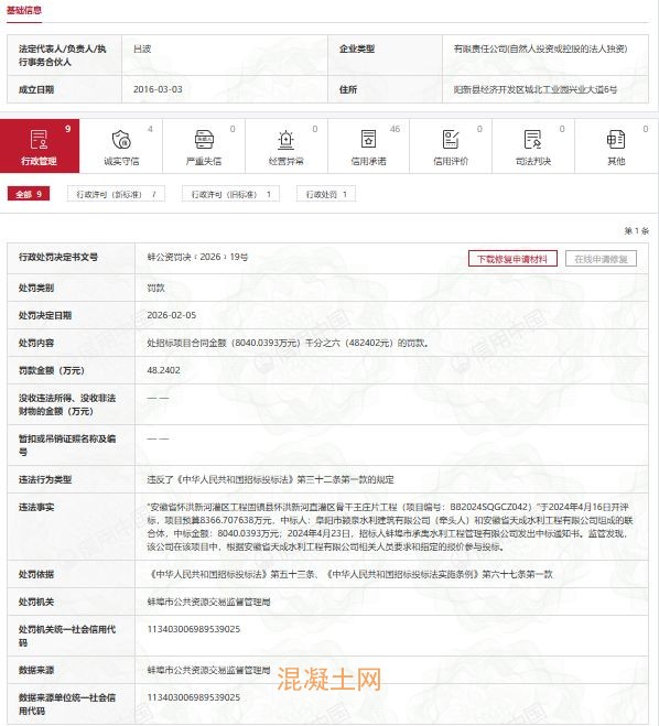 公开处罚信息显示,“安徽省怀洪新河灌区工程固镇县怀洪新河直灌区骨干王庄片工程(项目编号:BB2024SQGCZ042)”于2024年4月16日开评标,项目预算8366.707638万元,中标人:阜阳市颍泉水利建筑有限公司(牵头人)和安徽省天成水利工程有限公司组成的联合体,中标金额:8040.0393万元;2024年4月23日,招标人蚌埠市承禹水利工程管理有限公司发出中标通知书。监管发现,湖北建工集团在该项目招投标过程中,根据安徽省天成水利工程有限公司相关人员要求和指定的报价参与投标。