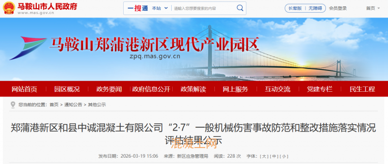 近日,安徽省马鞍山市郑蒲港新区应急管理局发布《郑蒲港新区和县中诚混凝土有限公司“2·7”一般机械伤害事故防范和整改措施落实情况评估结果公示》。2025年2月7日19时50分许,和县中诚混凝土有限公司在进行皮带机维修作业时发生一起机械伤害事故,造成1人死亡,直接经济损失约130万元;郑蒲港新区管委会于2025年3月28日对事故调查组请示的事故调查报告进行批复并结案。
