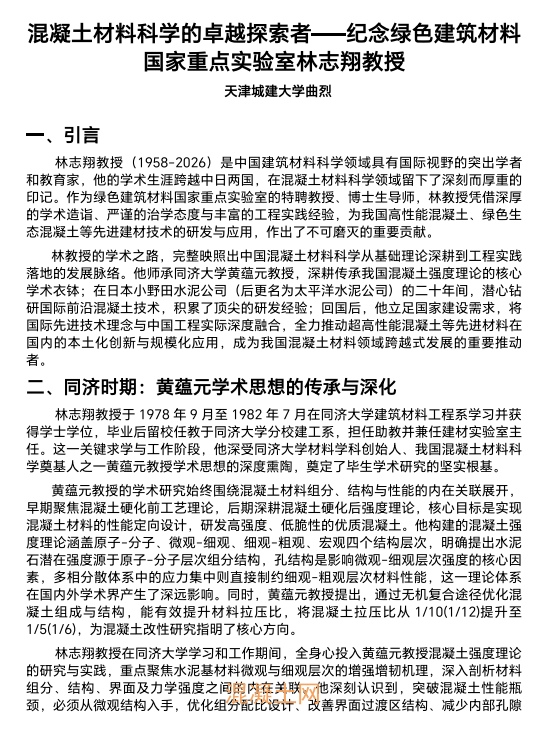 混凝土材料科学的卓越探索者——纪念绿色建筑材料国家重点实验室林志翔教授